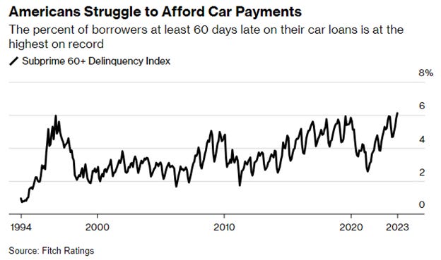 It’s not any better for individuals. Bloomberg recently ran a piece showing that subprime car loan delinquencies have surged to record high levels.