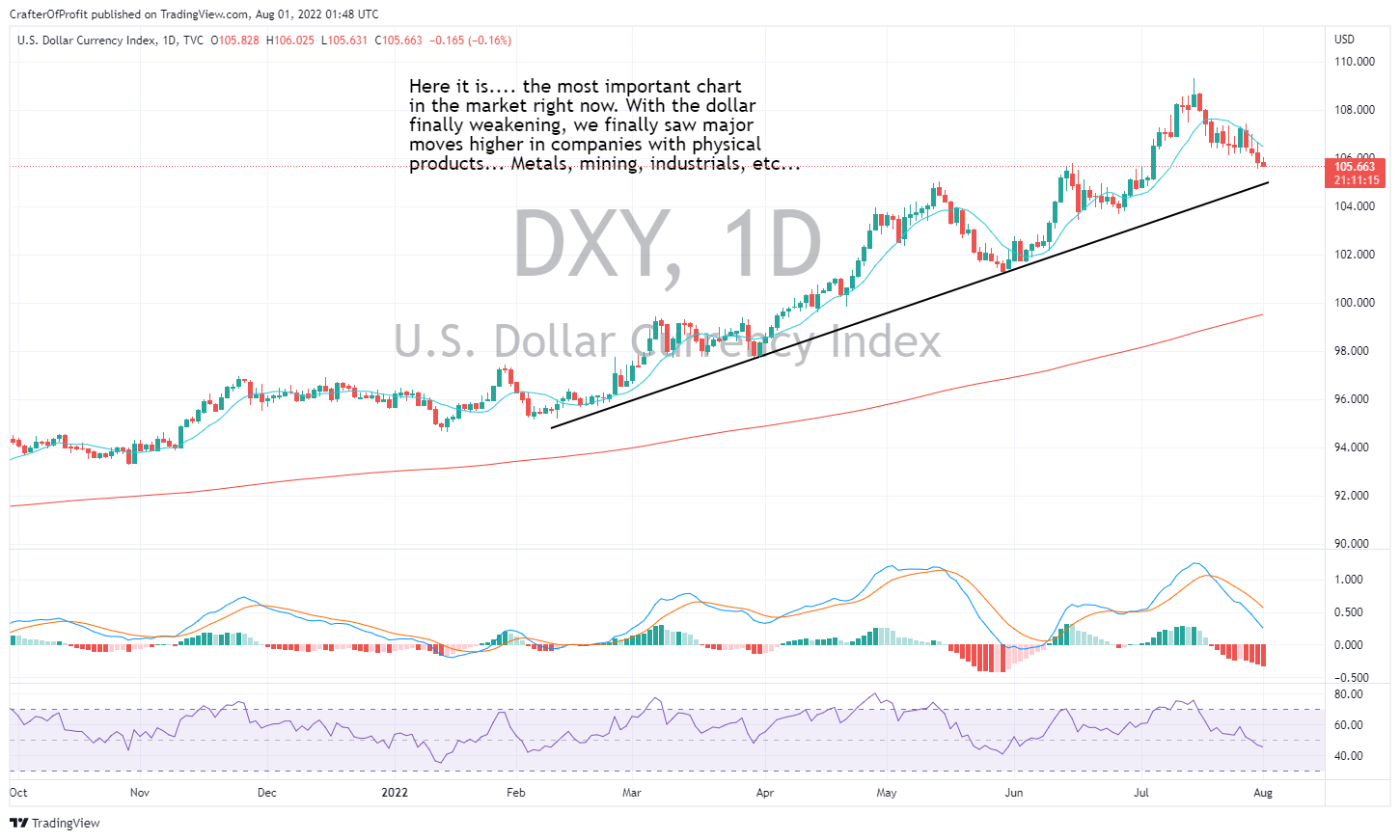 The dollar index. Finally the DXY is pulling back… And giving some relief for commodities and industrials. We’ll have to watch to see what it does this week. The DXY is getting a little closer to a support zone.
