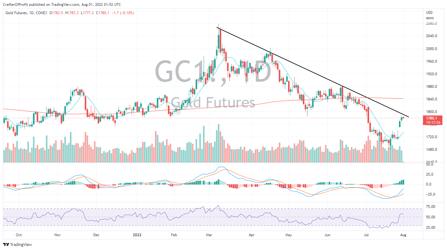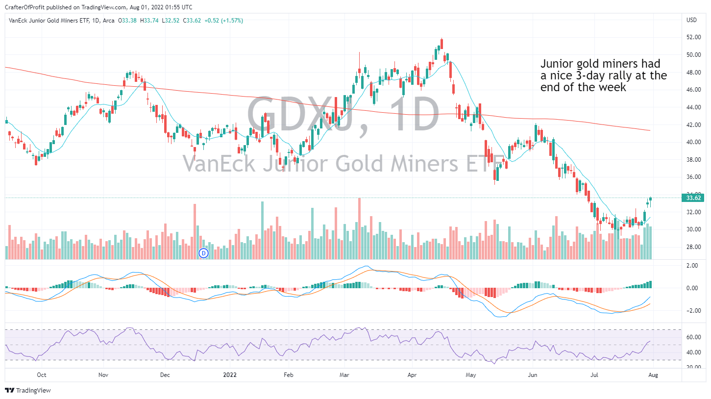 But this pullback led to a spike in prices for commodities. Look at gold, gold miners, and industrials.