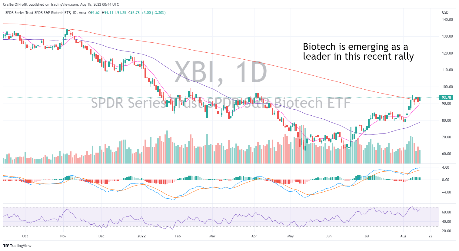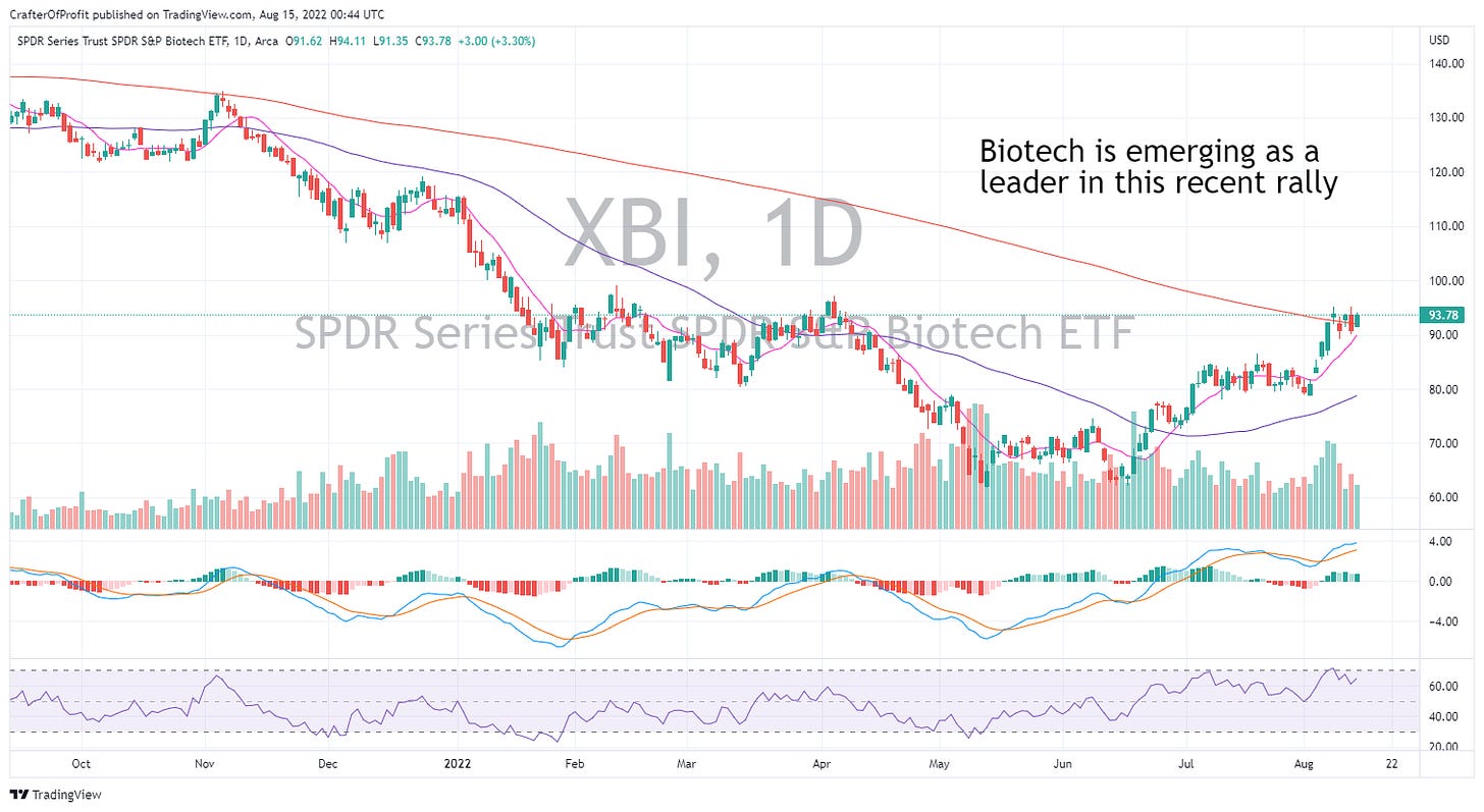 And biotechs are finally moving higher. The SPDR Biotech ETF XBI 0.00%↑ has shown some impressive price action on high volume since the bottom in June. And the MACD continues making new higher along with XBI. Super strong.