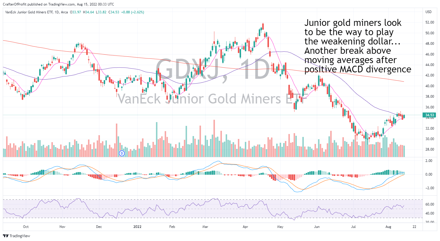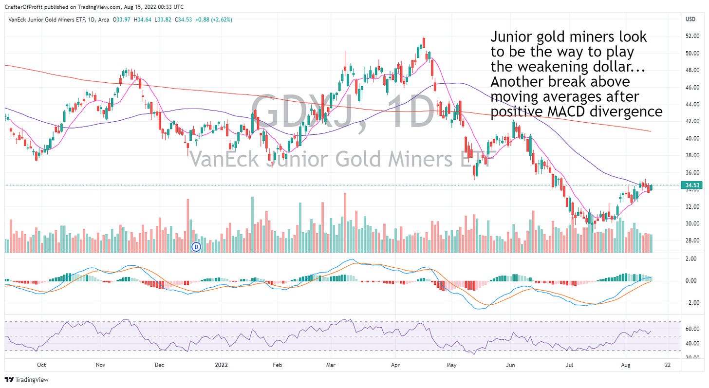 And another group poised to rally with the dollar weakening is junior gold miners. The junior gold miner ETF GDXJ 0.00%↑ had a great showing this past week.