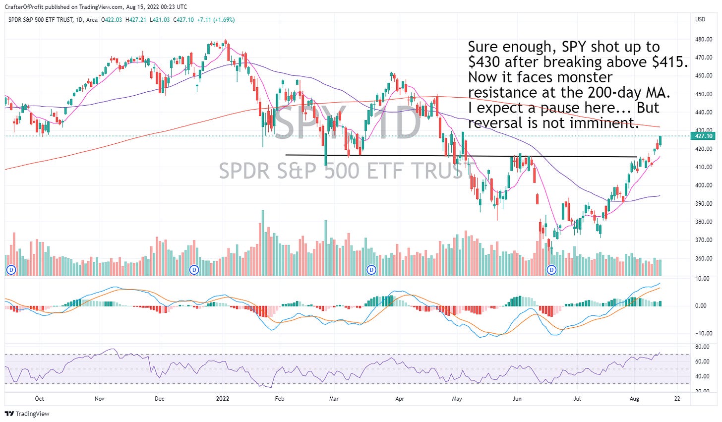 As you can see in the S&P 500 ETF ($SPY) chart, we are quickly approaching resistance.