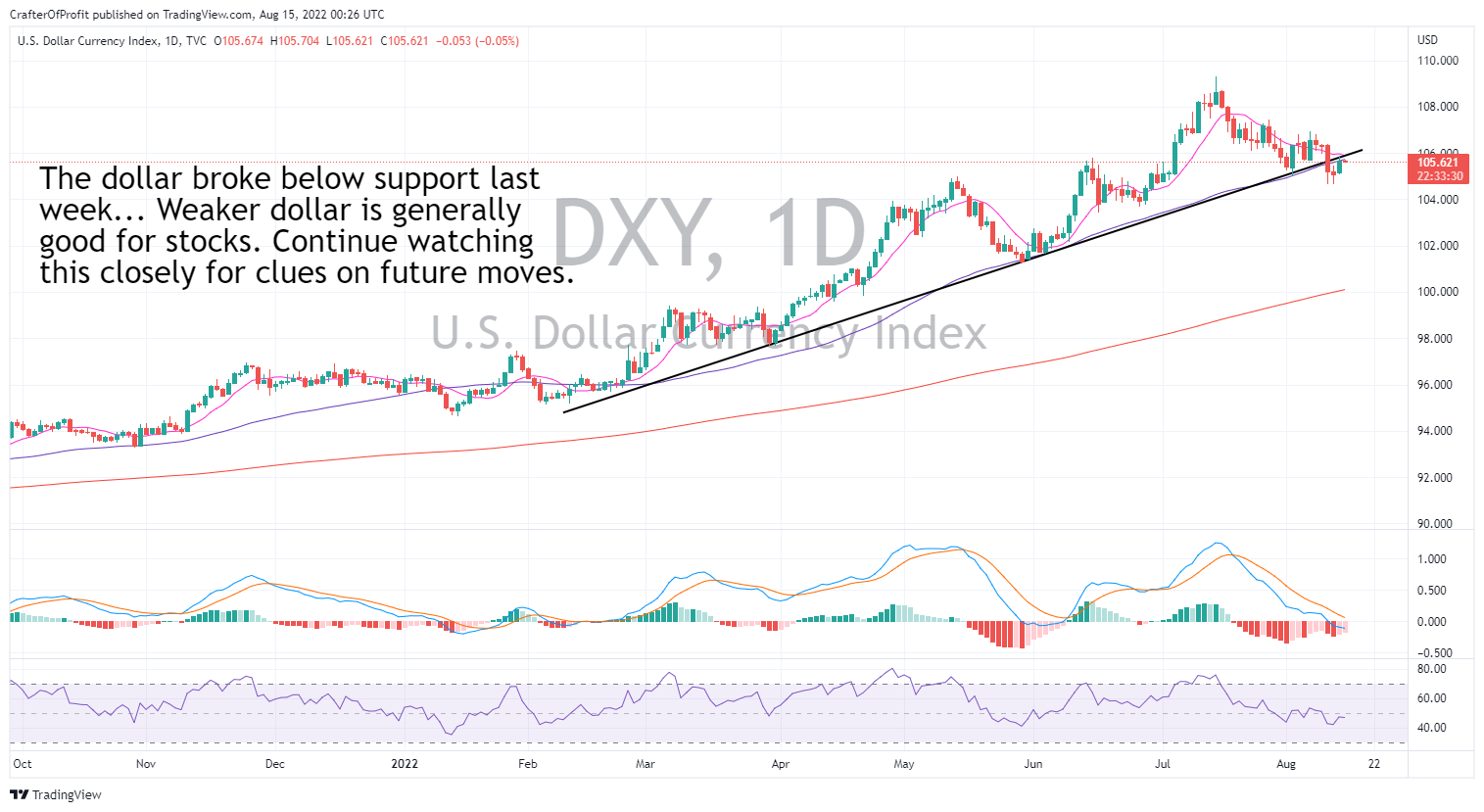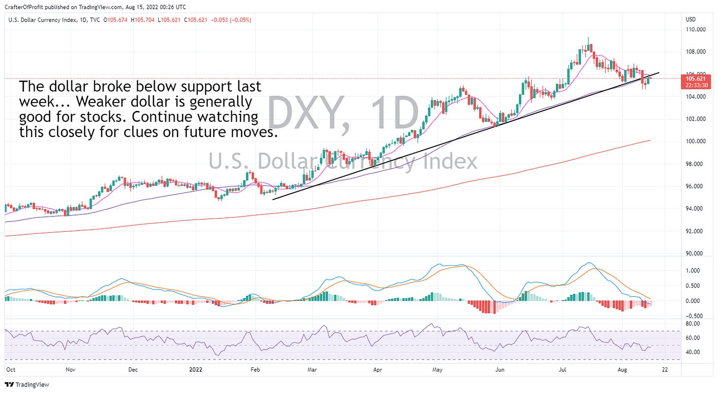 And that is the dollar. The Dollar Index (DXY) is looking like it’s ready to breakdown. A lower (weaker) dollar generally pushes stocks higher.