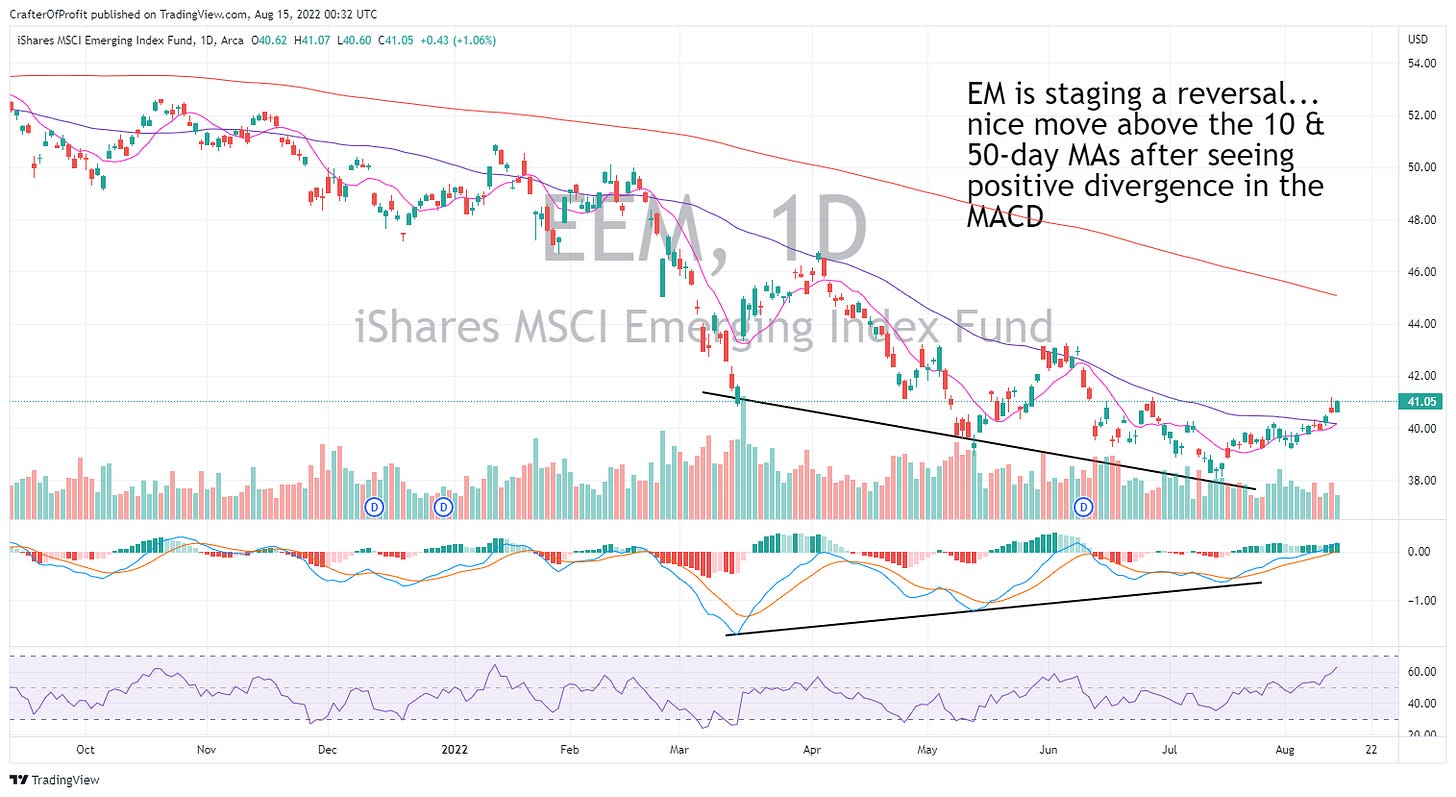 Typically a weaker dollar leads to good things in emerging markets stocks. And the Emerging Markets ETF EEM 0.00%↑ is reversing higher as we speak.