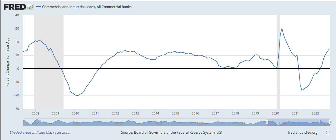But as we can see, the Fed hasn’t slowed down the economy at all. And these higher interest rates haven’t stopped businesses from borrowing. As of October, business loan growth reached 15%. With the exception of weirdness in 2020, this is the fastest businesses have borrowed in 15 years.