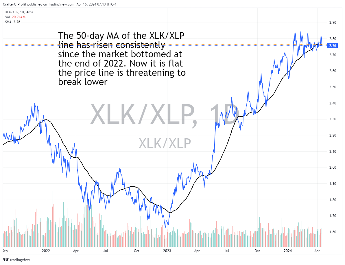 I’ve got a chart below that takes the Tech ETF (XLK) and divides it by the Consumer Staples ETF (XLP). When the line goes up, it means that tech is outperforming. When the line goes down it means consumer staples are doing better as investors are looking for safety. And now the ratio line is threatening to break below the 50-day MA and that MA line is about to turn lower for the first time since the market bottomed.