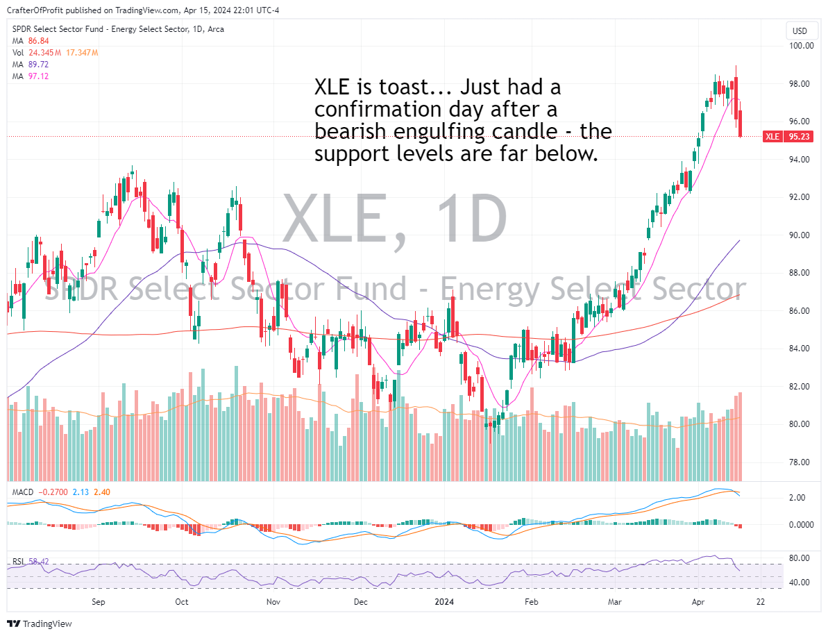 Just look at the Energy Sector ETF (XLE). This is a classic reversal. On Friday we had a bearish engulfing pattern and then the pattern was confirmed by a follow-through day lower yesterday.