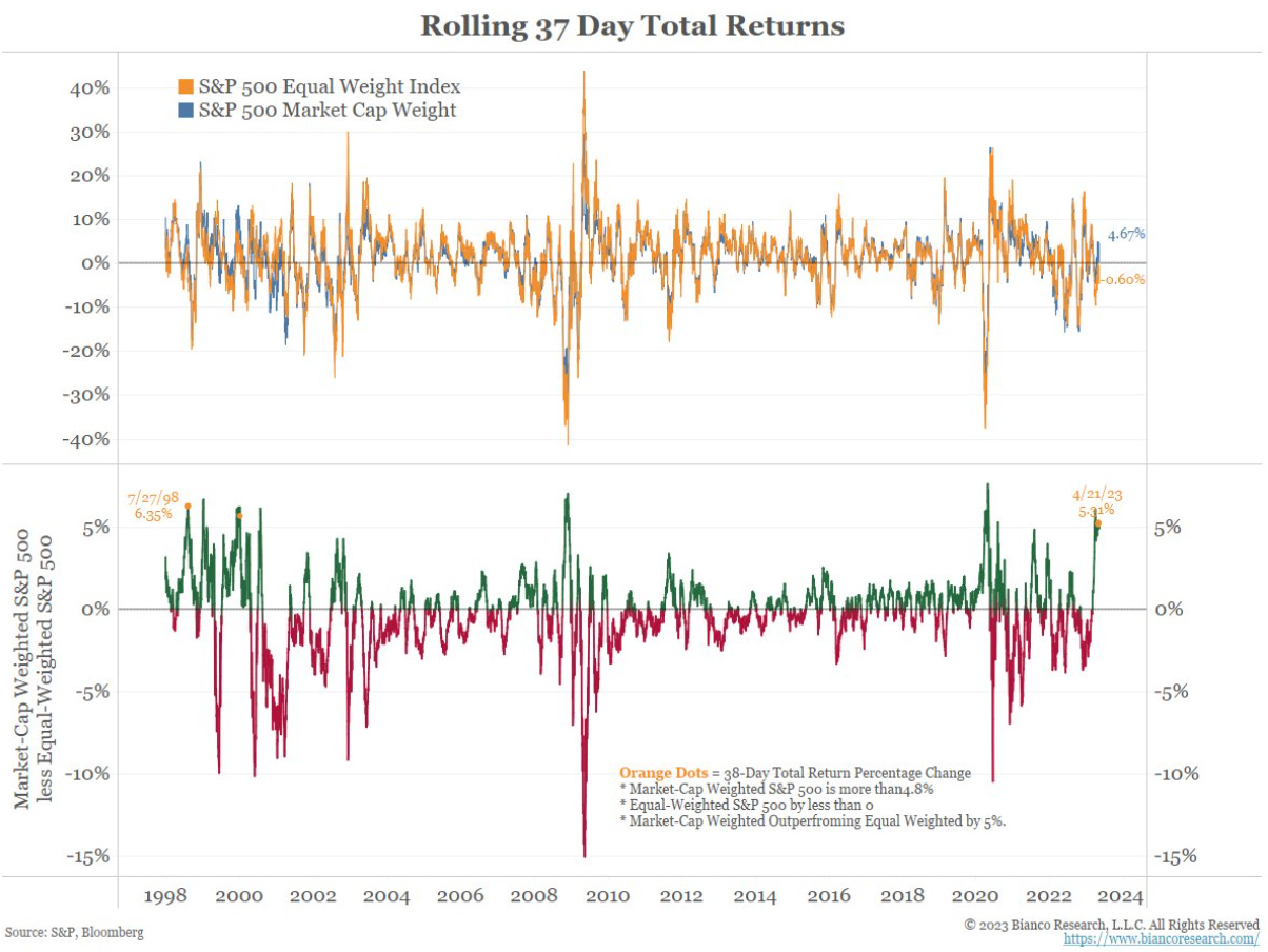 Here is a chart from Bianco Research showing the 37-day rolling returns of the S&P 500 index vs the S&P 500 equal-weighted index. The bottom half is the important one to look at. And as shown, this is the highest level of outperformance since the periods we mentioned above.