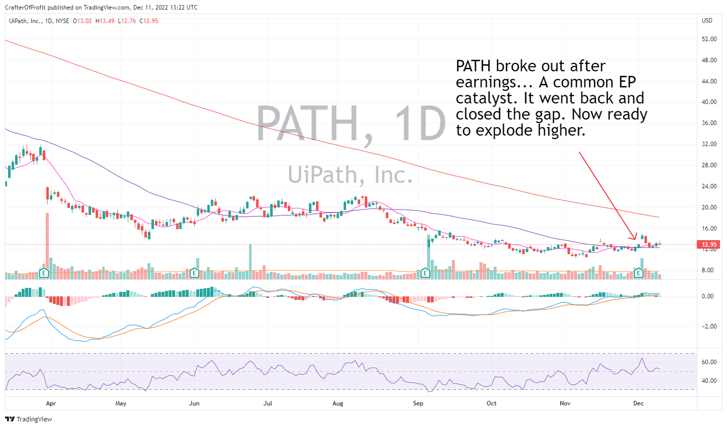 Let’s start by talking about PATH. The ones that don’t work out right away always require the most attention. But PATH looks like it is trying to form a reversal. We have little risk holding onto this one right now, it’s trading right at support on its 50-day and 10-day moving averages.