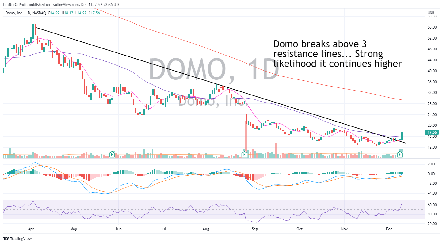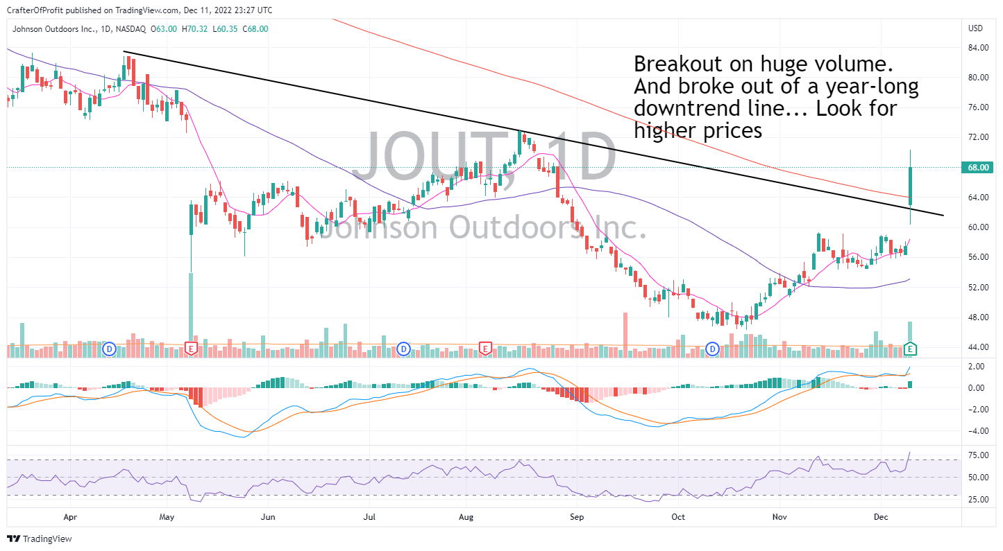 I like this pattern of a massive break above the 10 and 50-day moving averages… As well as above a long-term downtrend line. And the high volume shows massive accumulation of shares.