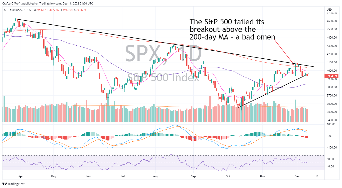 Take a look at the chart below. As I pointed out last week, the S&P 500 index failed to break out above the 200-day MA and long-term downtrend line. And then on Friday, it broke below it’s short-term uptrend line.