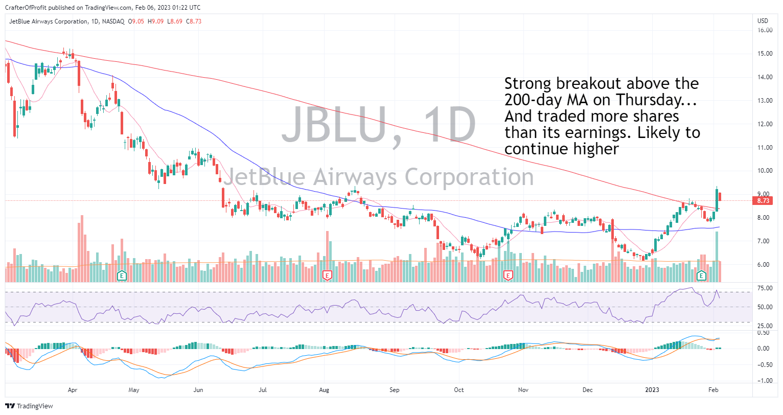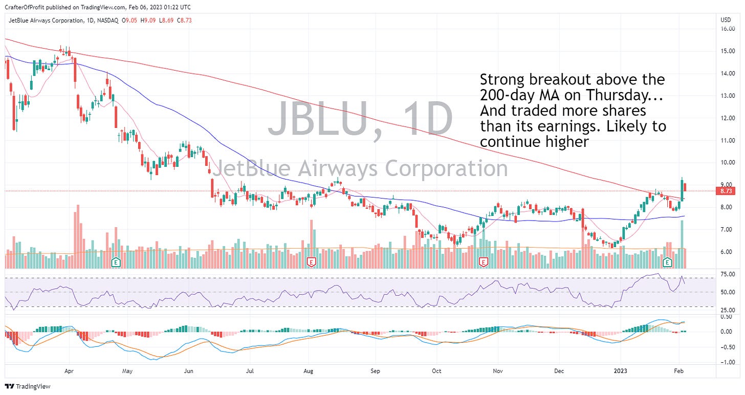JetBlue had a massive trading day on high volume and Thursday. The news was that their groundworkers decided against joining the machinists union… Which would have likely led to higher costs for JetBlue.