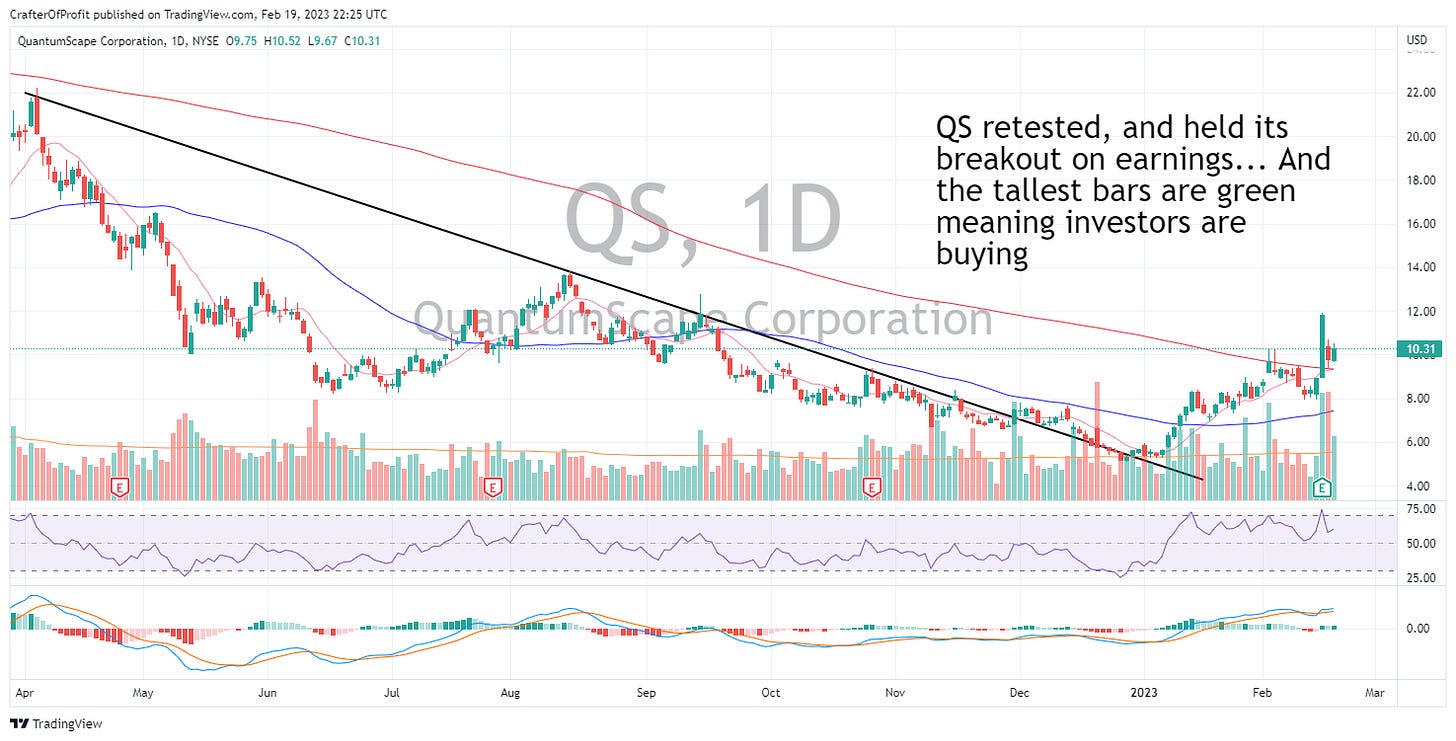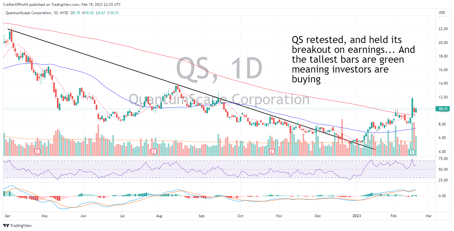 Much like the first two, QS showed great volume on a breakout after its earnings report. I’m encouraged by the price action here… And if people start to get excited about this one, the stock could rocket many multiples higher. This stock is a great momentum play.
