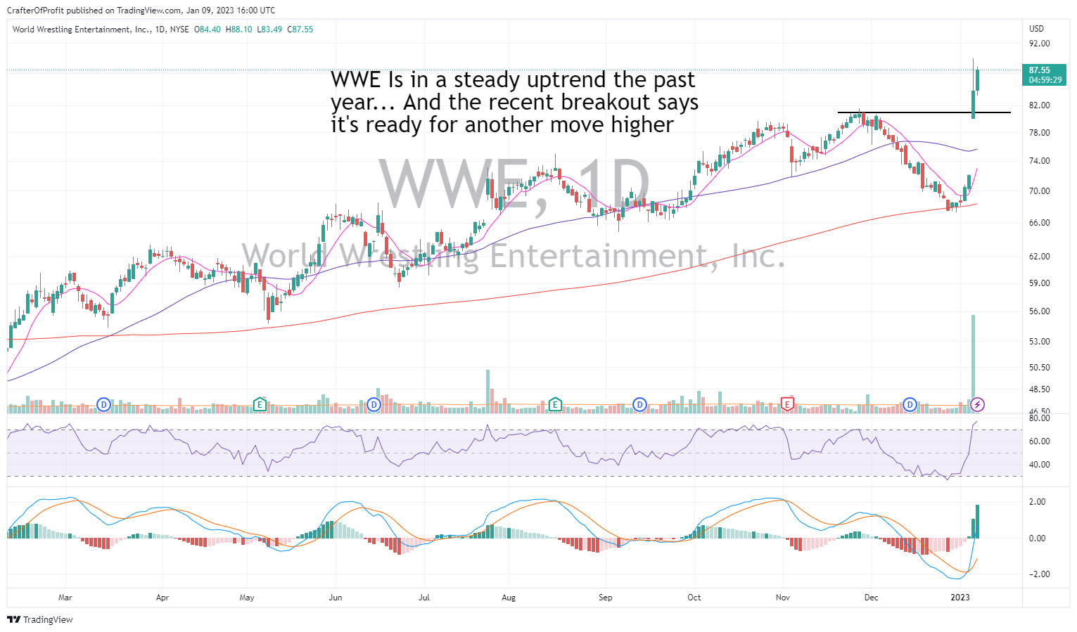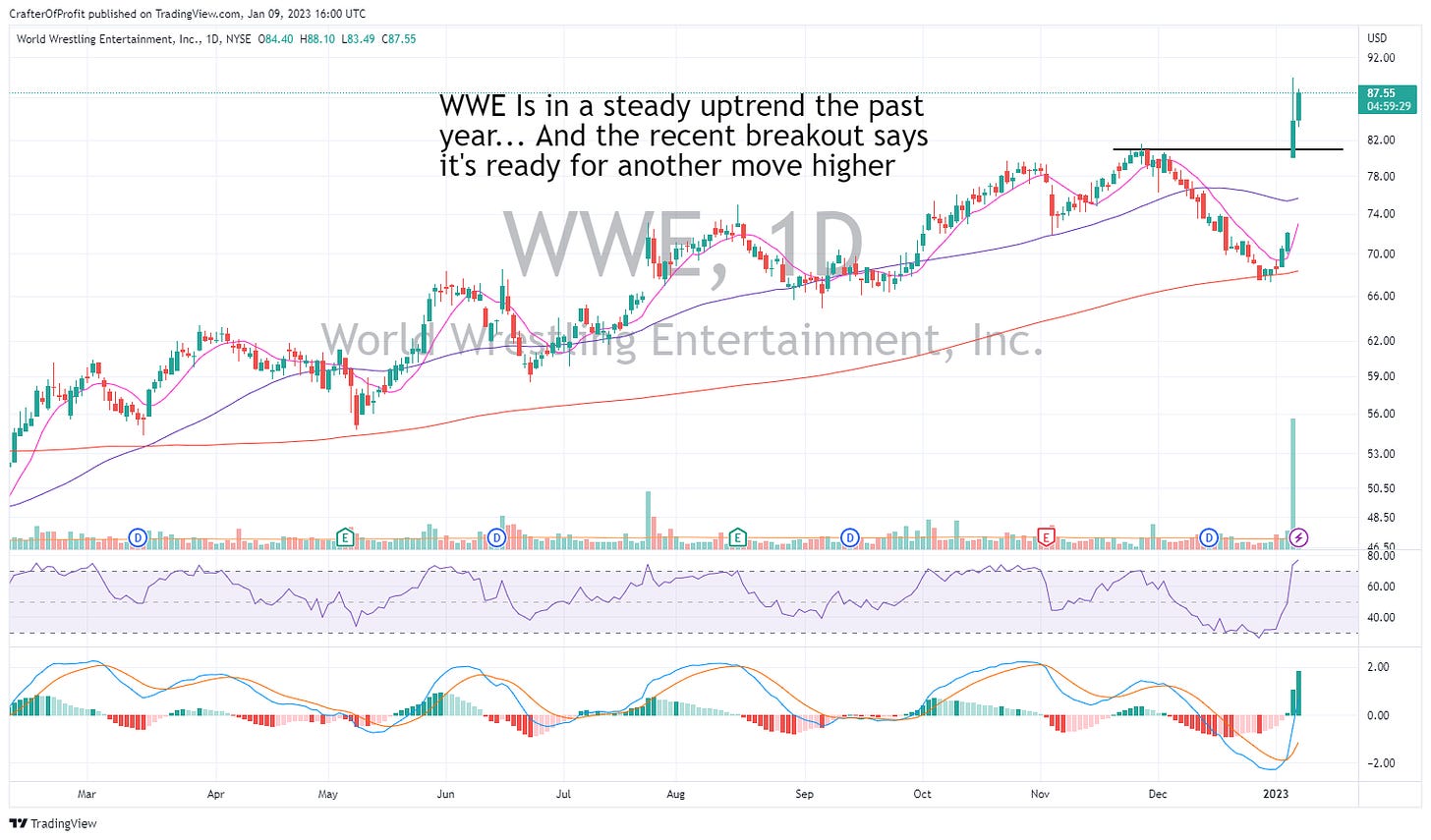 This shot higher last week on huge volume as founder Vince McMahon said he was going to get back on the Board of Directors. This is the man who built the WWE into what it is today. So it’s not surprising that investors loved to hear that he was coming back.