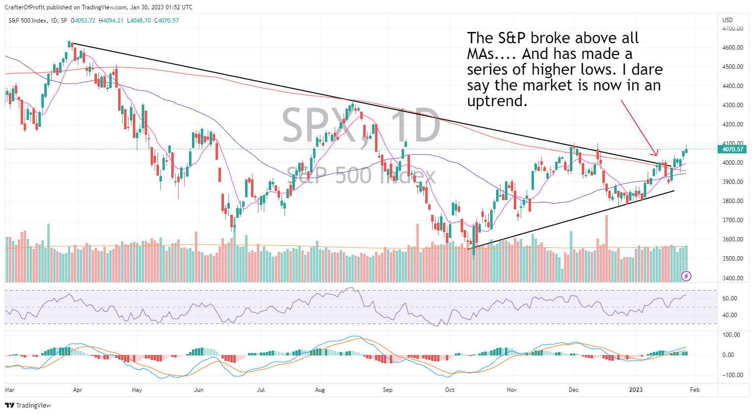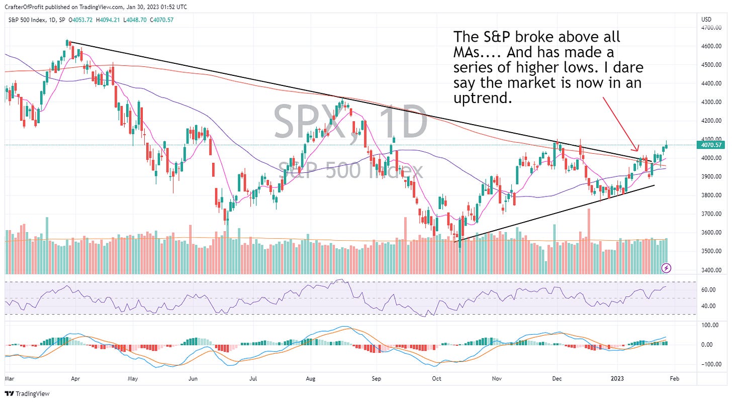 Last week we said the market was a coiled spring ready to explode… This week it exploded higher. We’re now higher than all the moving average lines on the S&P 500. And we now must have a tendency towards being long.