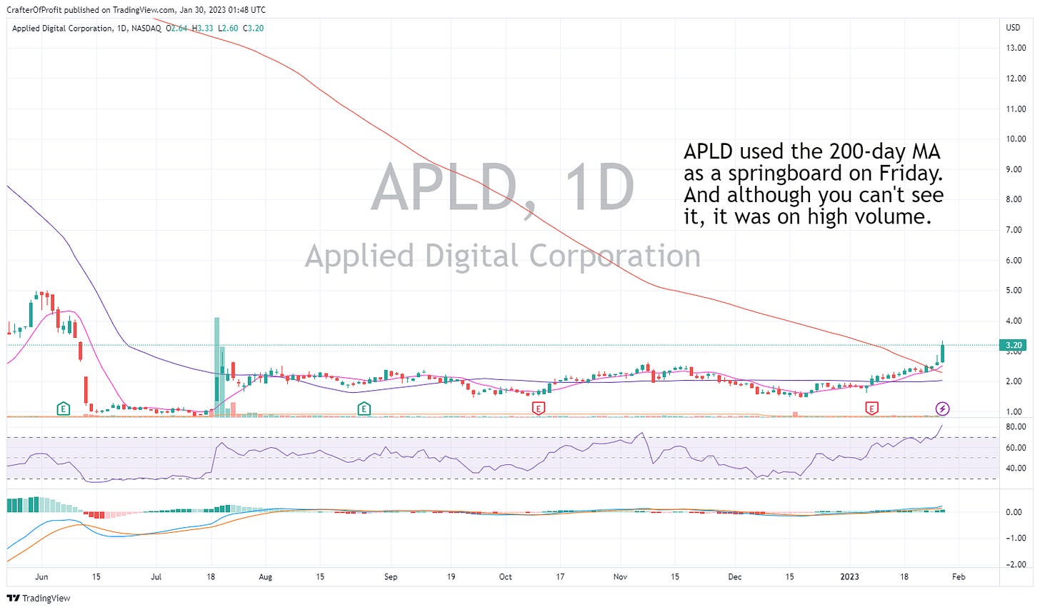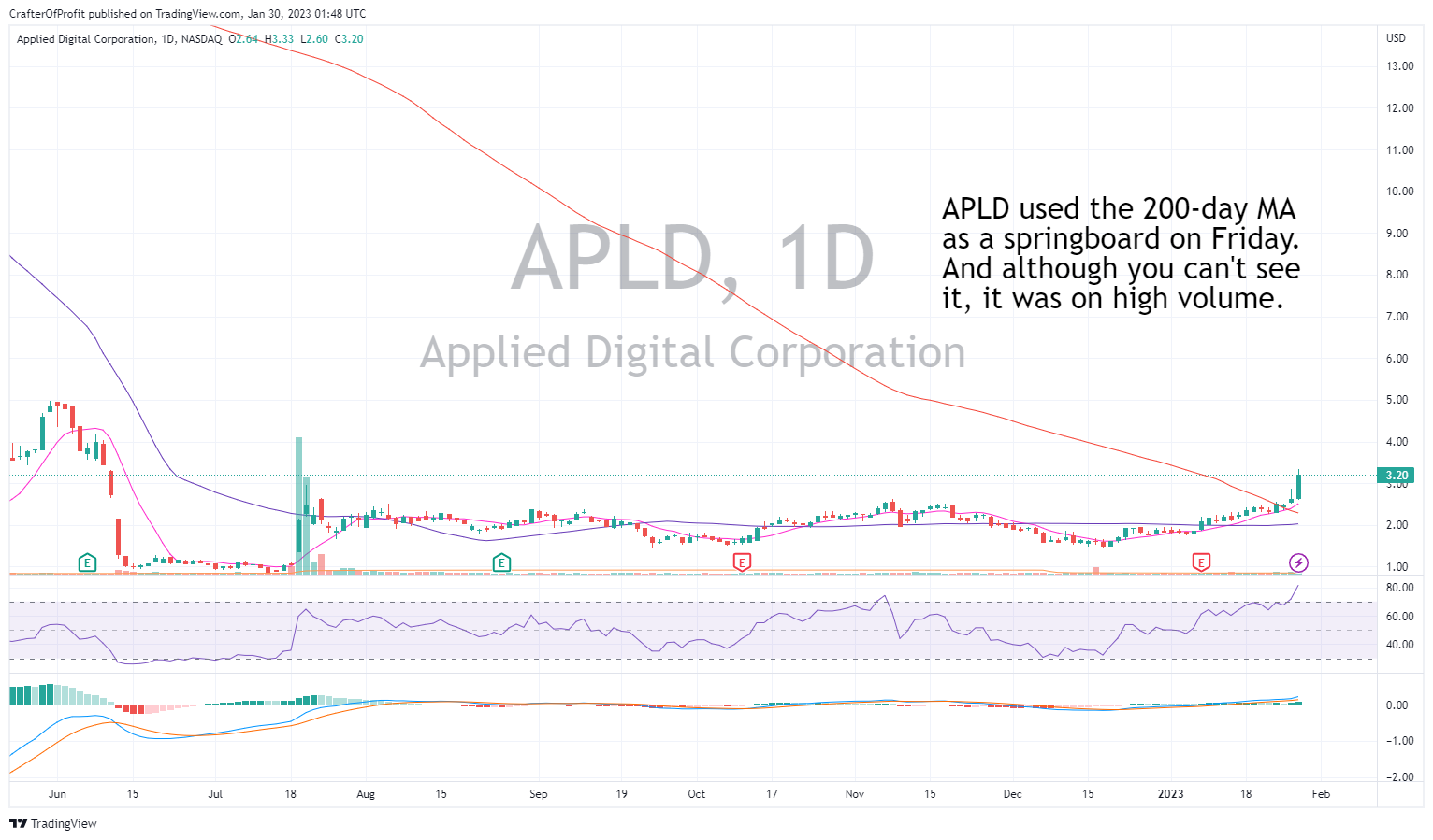 Like many of our charts APLD surged higher on big volume. We’ll hold this one with a stop on the 50-day MA.