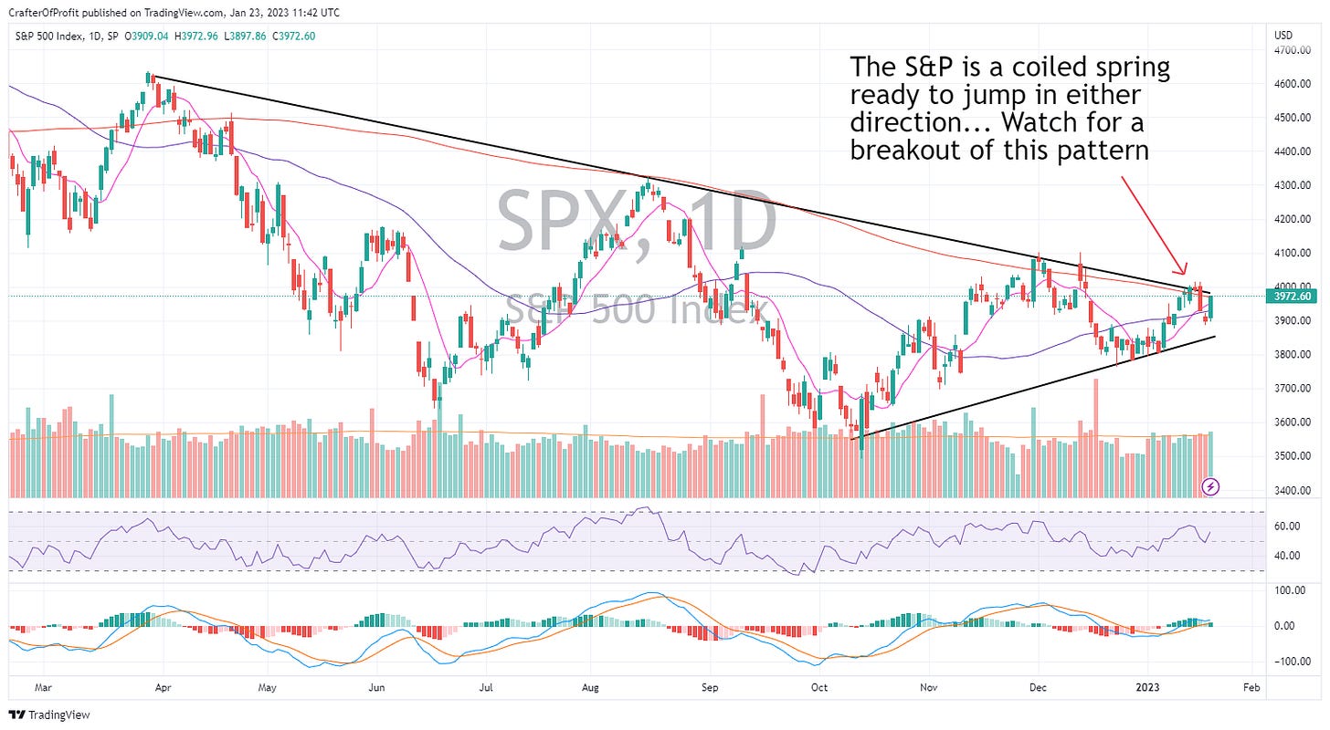 The chart has two important lines. The year-long downtrend line and the uptrend line of the recent rally. These two lines are getting very close to each other. Technicians call this a coiled spring. Because when the price breaks out of this pattern, it violently moves one way or the other… We just can’t predict which way it’ll be.