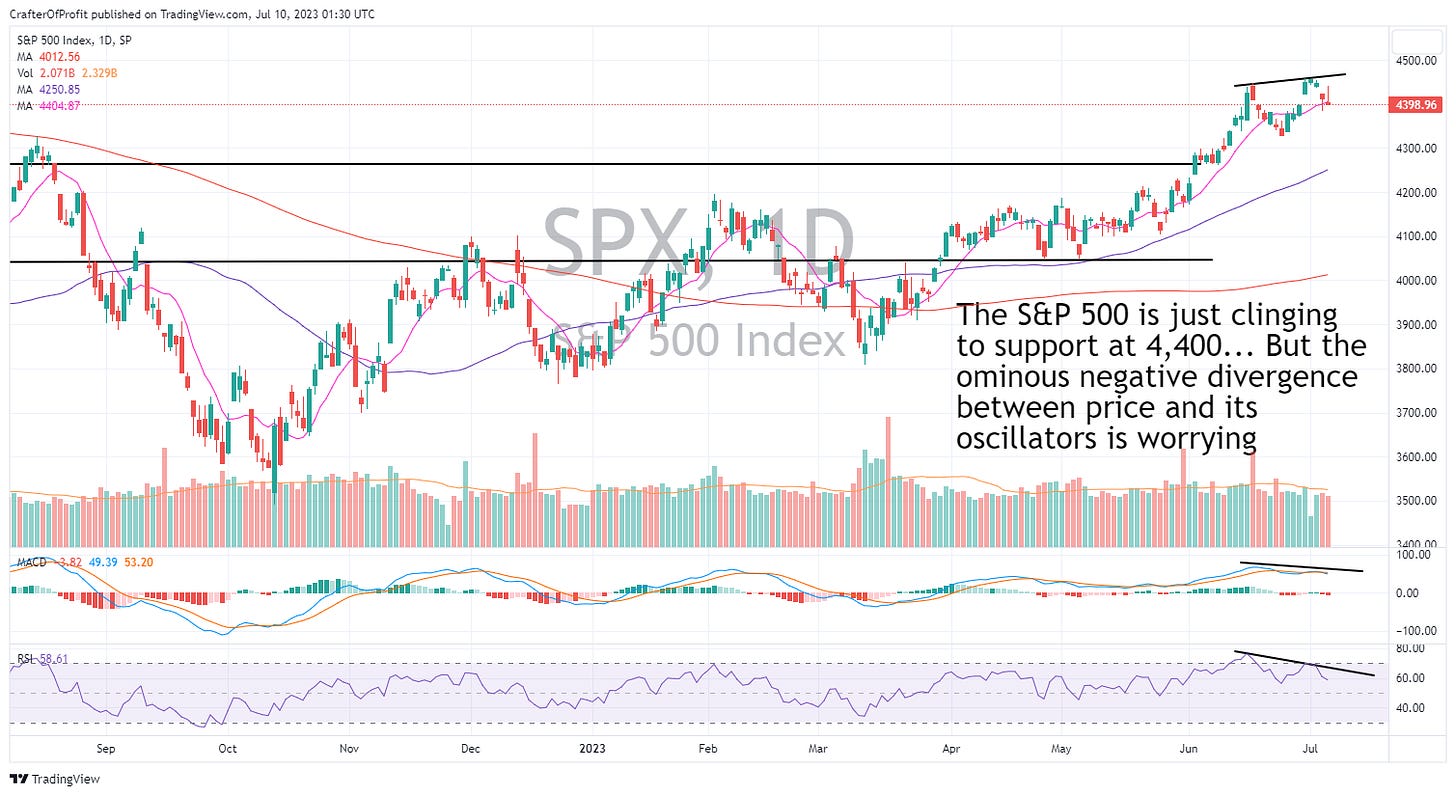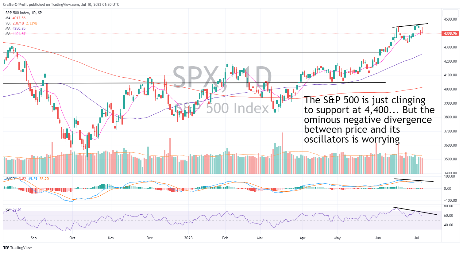 That’s not good. The index is just hanging onto its 10-day moving average at 4,400.