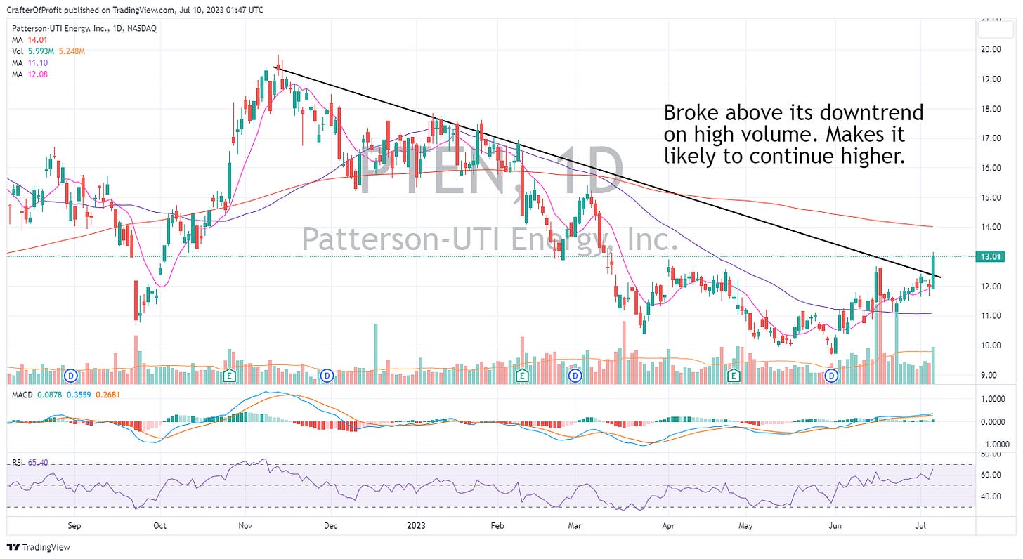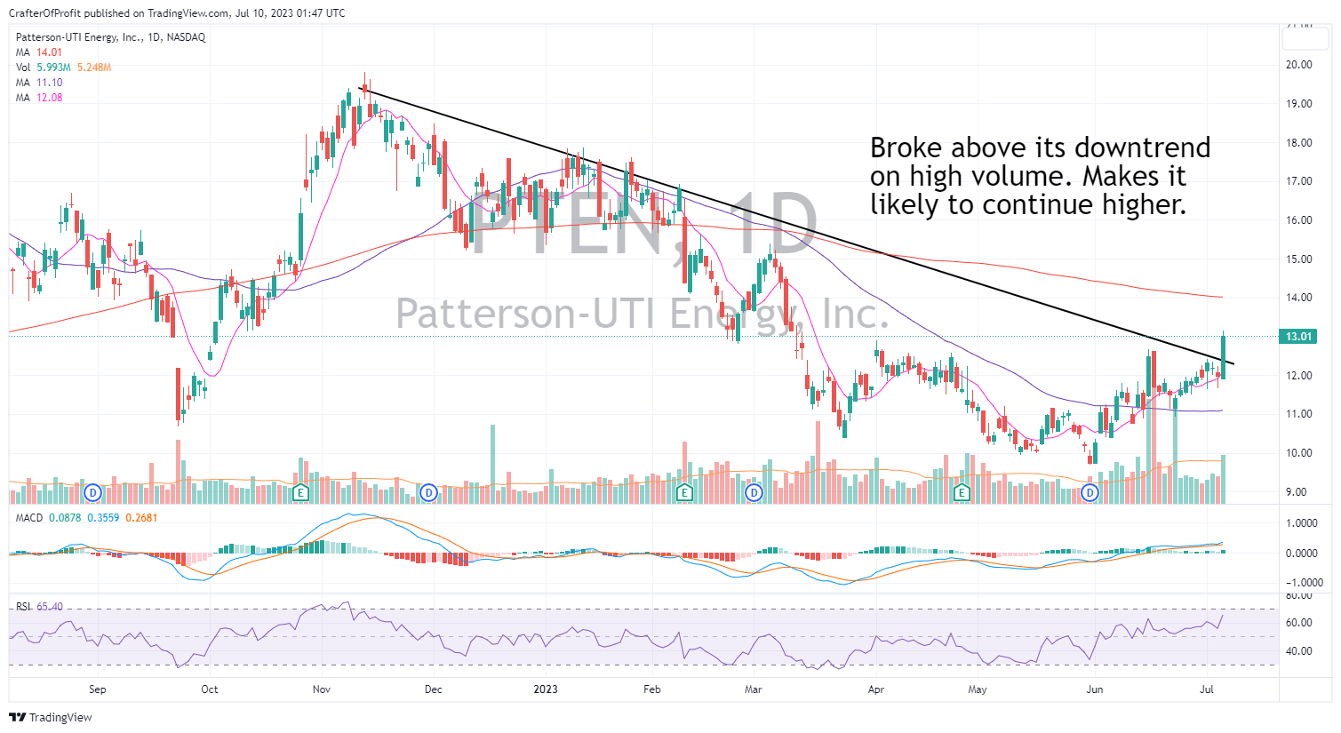 But this past week, it just shot above it’s recent downtrend line. And hopefully this change of trend will continue. Let’s buy this on Monday. And we’ll use the 50-day MA for a stop as well.