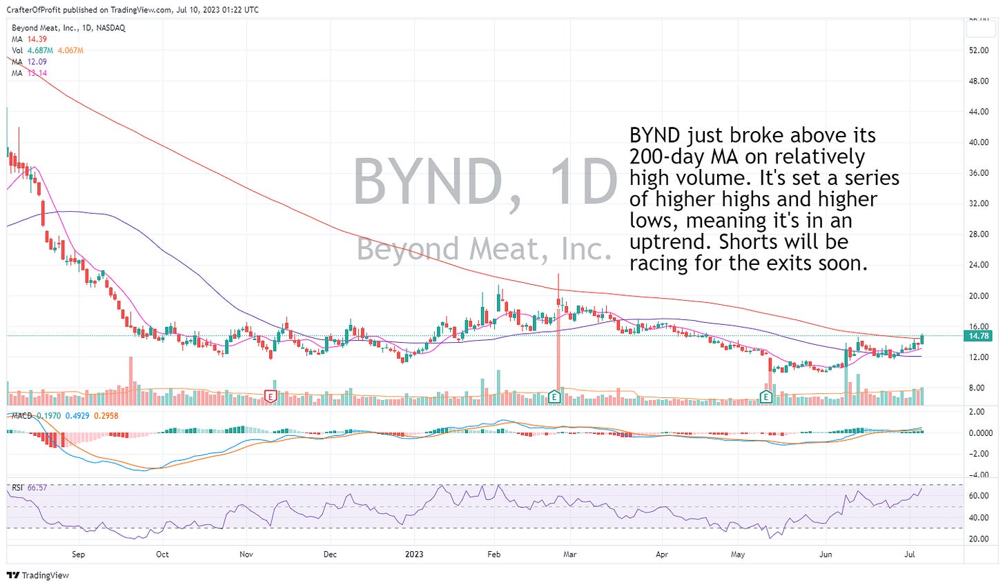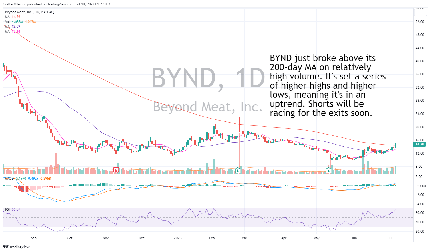 Beyond Meat is our short squeeze candidate for the week. It’s surged above all its moving averages and has no serious resistance above it now. This makes it ripe for a short squeeze if the shorts start to feel the pressure.
