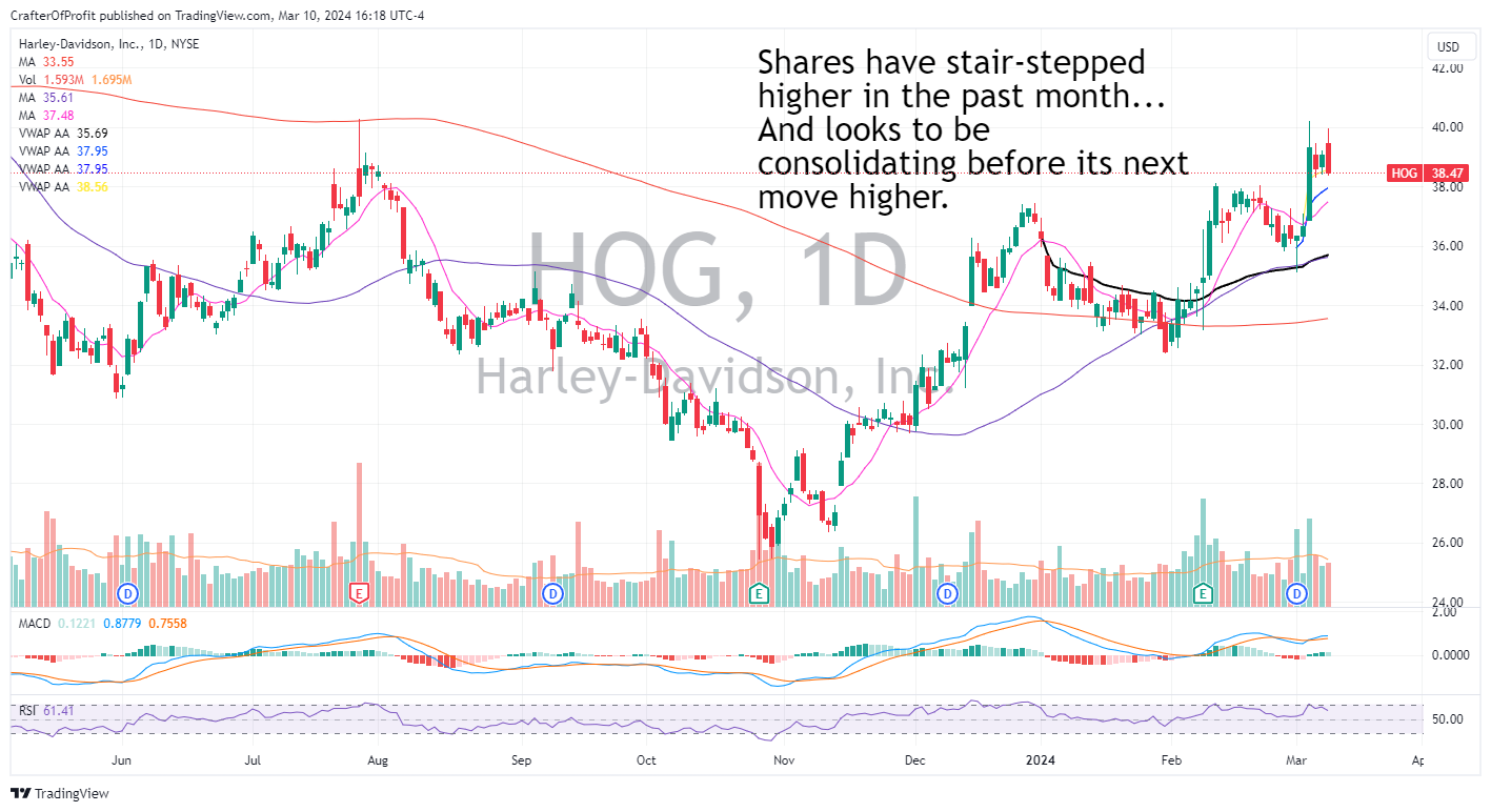 Let’s buy shares of HOG Monday morning. And we’ll use a tight stop of its YTD anchored VWAP which currently sits just below $36.