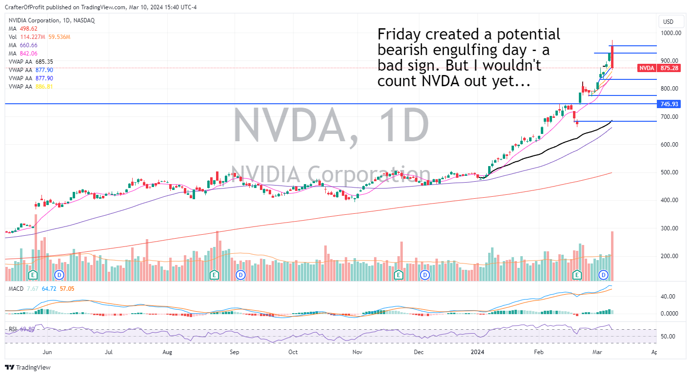 Here’s a chart of NVDA. You’ll see it has a huge bearish engulfing candle and enormous volume. More shares traded Friday than the day after its earnings report. And if we see another down day Monday, it could signal that semis – and by extension the market – have reached a short-term top.