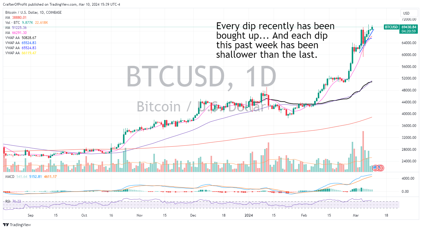 The inflows in the new physical bitcoin ETFs have been much higher than expected. And Michael Saylor is in the process of raising $700 million in convertible notes to buy up more bitcoin. The demand for bitcoin appears to be increasing into its halving event next month.