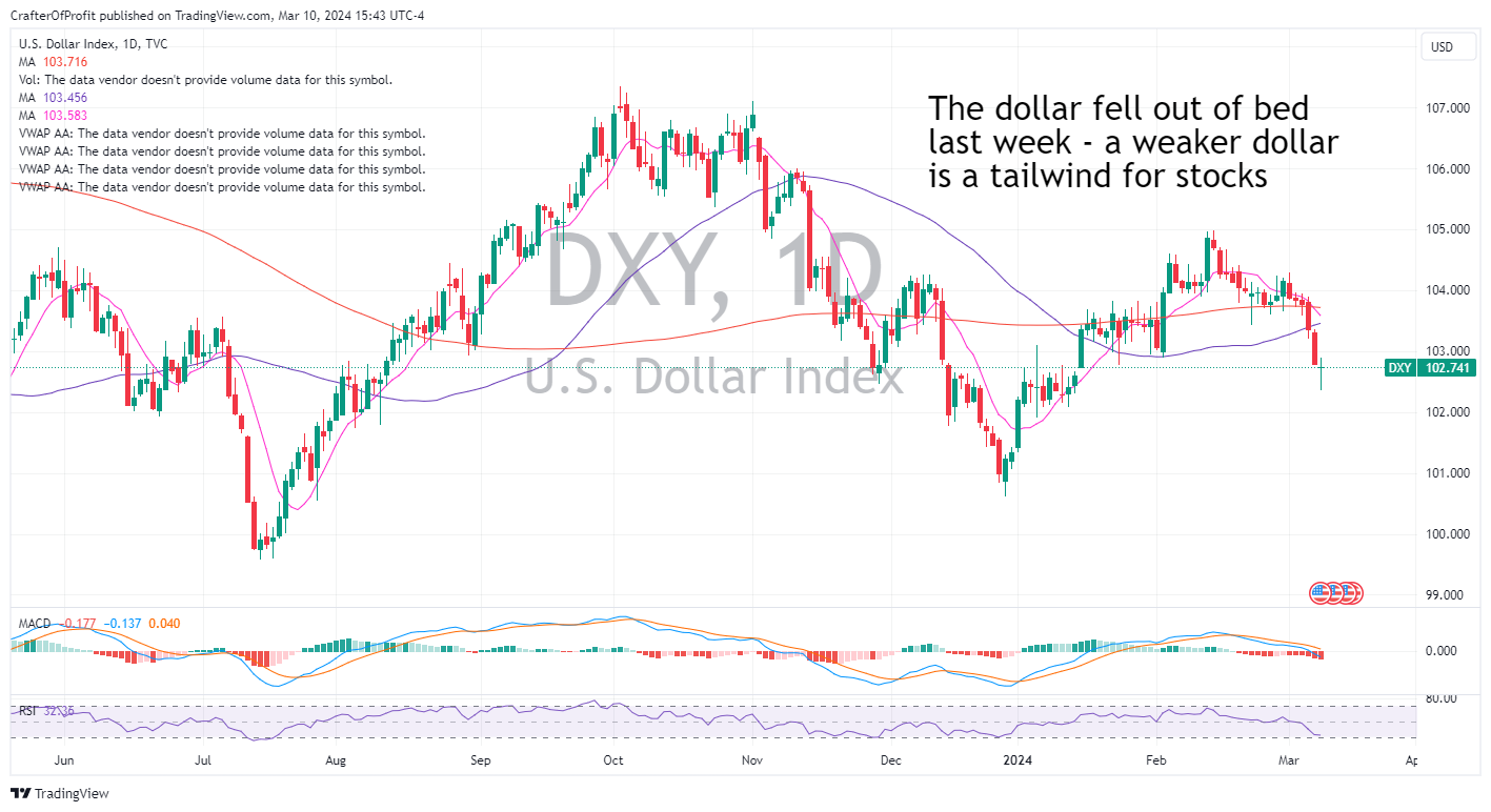 We also see the dollar index looking like it wants to roll over. A weaker dollar usually leads to higher stock prices. So that will also be a boost for the market.