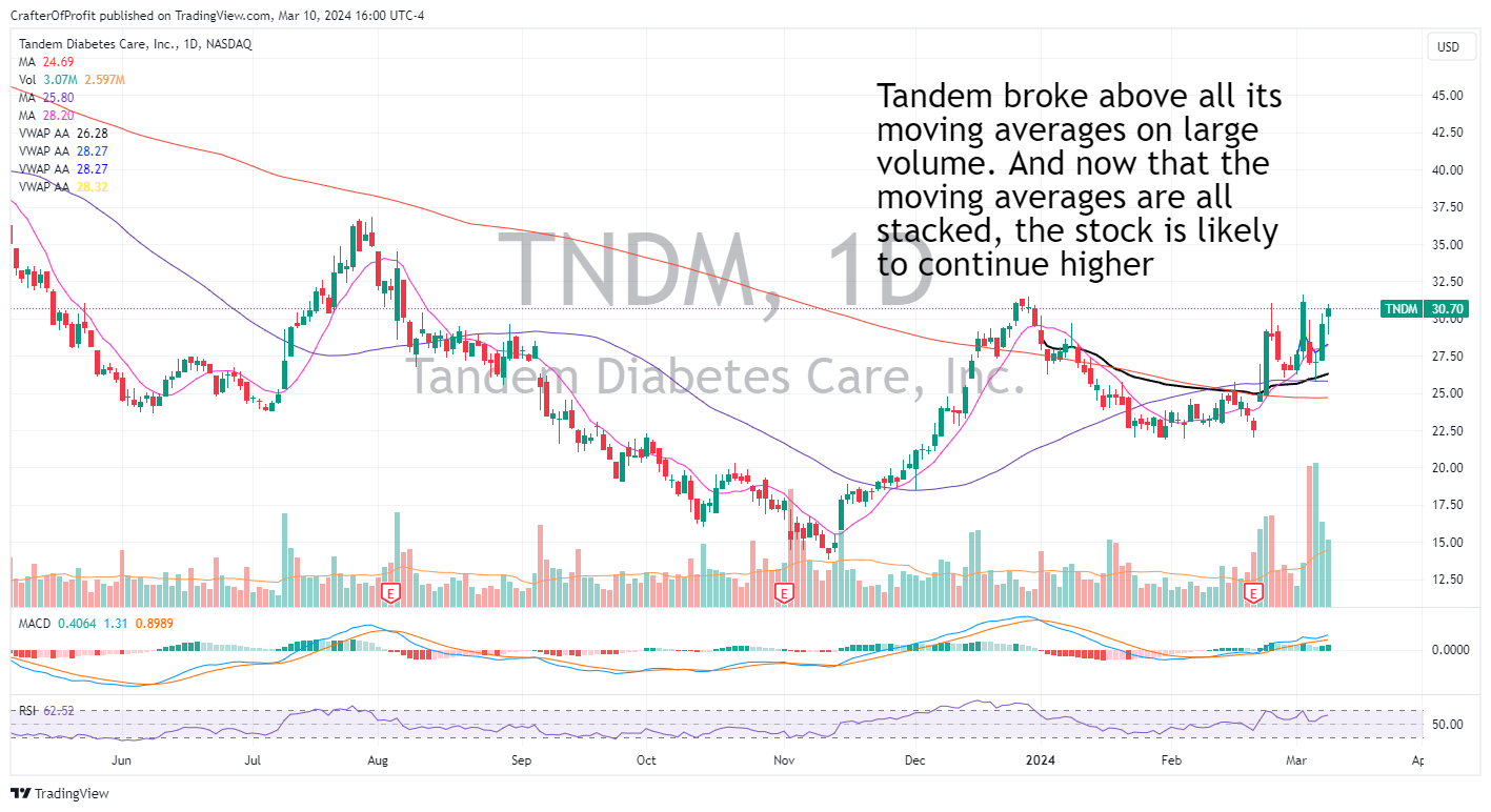 Other technicals look great too. You can see the bounce happened as the price of TNDM just touched its YTD anchored VWAP (thick black line). And now the 10-day moving average is above the 50-day and the 50-day is above the 200-day. Which is what you want to see for strong uptrends. And the price is above all three of those moving averages.