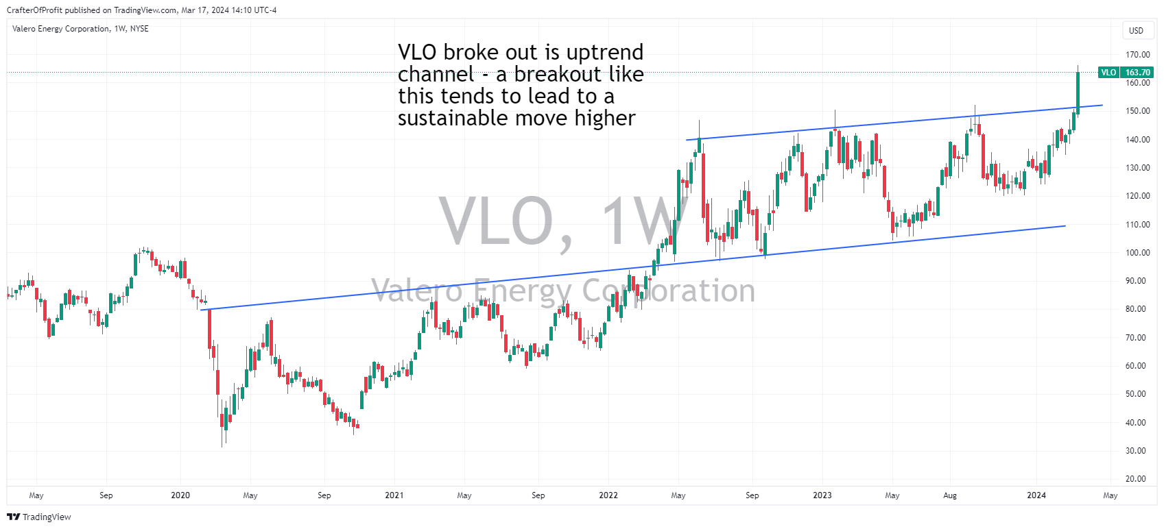 As you can see in the chart below, price had remained in a steady uptrend for the past couple of years. I know we don’t often look at weekly charts here, but now price broke above the resistance line of the channel. I believe that line will become the new support line. And that leaves VLO to go much higher.