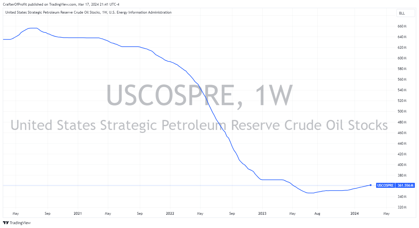 This is likely to continue as well. One big reason for that, is that the United States is finally buying oil to restock the strategic petroleum reserves. The price of oil was brought down as the SPR was tapped a couple of years ago. And as we can see below, America is working on restocking the reserve. This should create a consistent bid on the price of oil.