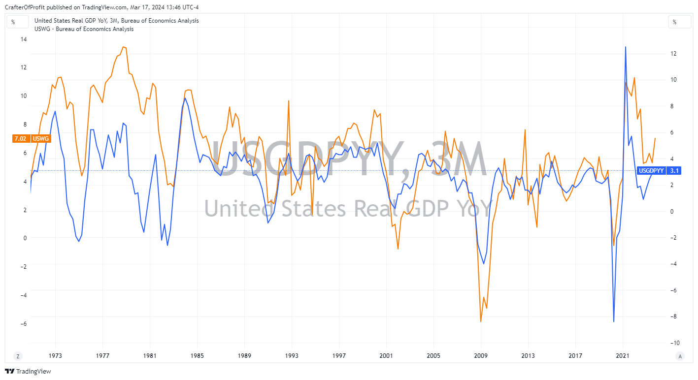 The facts show that the economy is strong. We can see in the chart below that Real GDP (blue line) currently sits at 3.1% annual growth – or about average. And then we can see wage growth (orange line) is ticking up to about 5.5% annual growth.