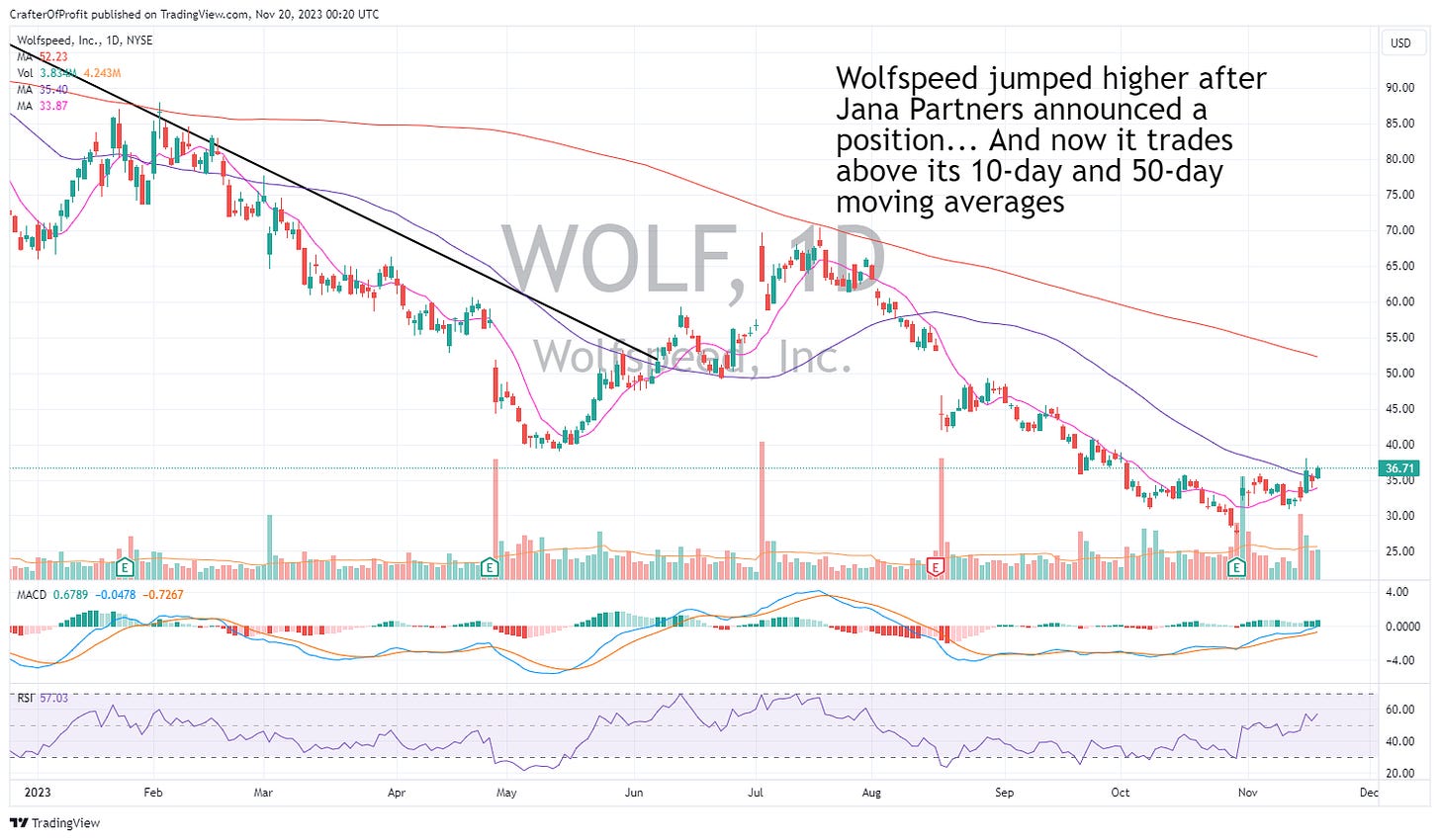 These two factors make it likely the trend will change in Wolfspeed and we can make a little money in this company as this rally continues. And that’s confirmed by the fact that the price broke above its 10-day and 50-day moving averages. That’s strong price action that often comes before a run higher.