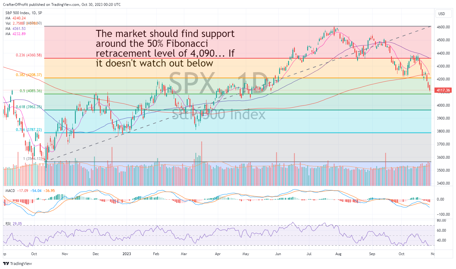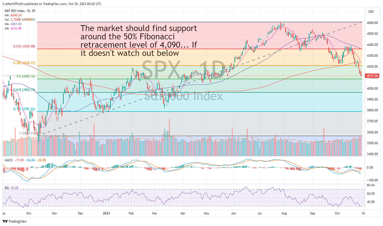 A 50% retracement is when many pullbacks in a bull market end. It’s common to shake out some of the weak hands before starting the next leg higher. And if we look at the chart below, we can see the 50% retracement line (green) is near 4,090.