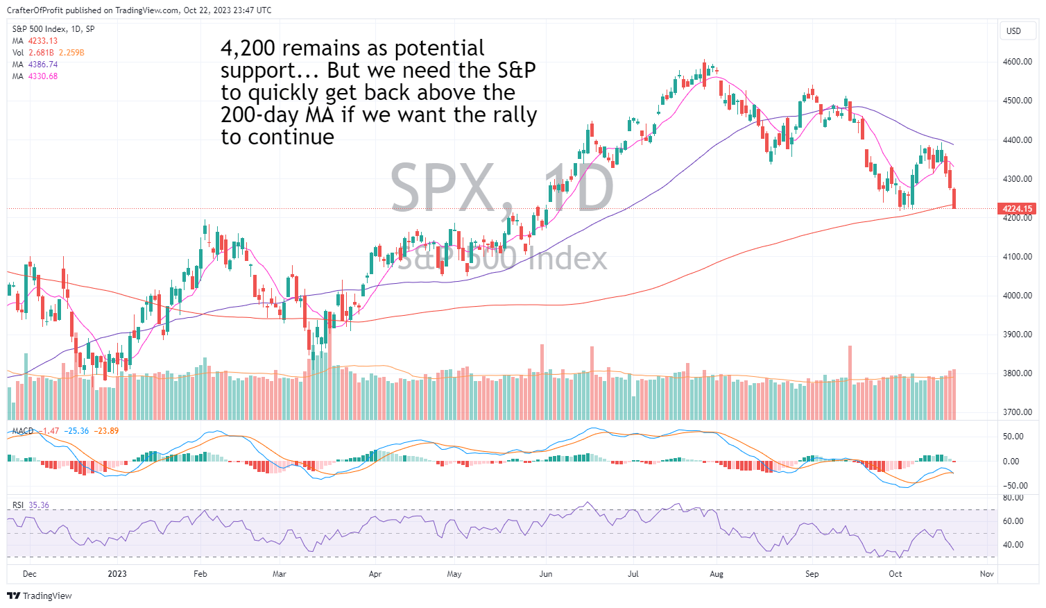 The index actually closed below the support of the 200-day MA on Friday. Regular readers know I hold the 200-day MA in high regard. And a break below that would be very bad for the market.