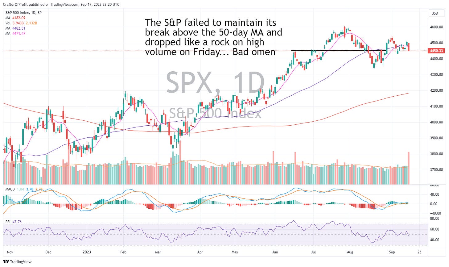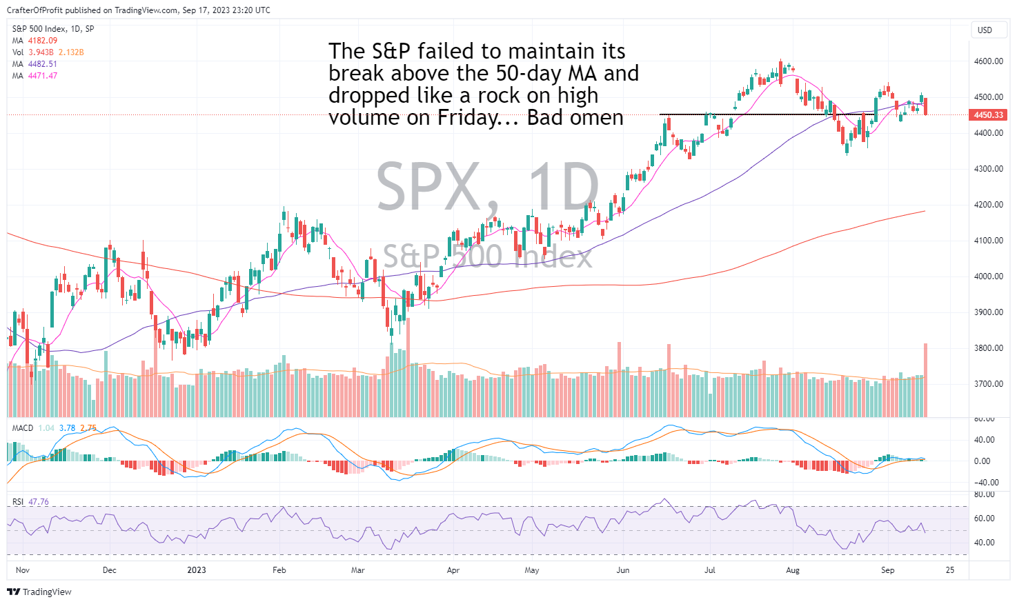 Below is a chart of the S&P 500 Index. You’ll see that Friday’s candle cut through the support at the 10-day and 50-day moving averages. Not a strong day.